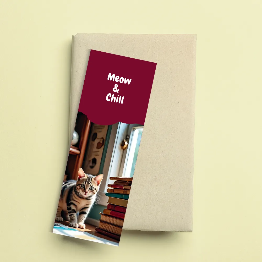 Perfect for book lovers and cat enthusiasts alike, this high-quality bookmark features a sweet, curious tabby kitten surrounded by cozy stacks of books in a sunlit room. The rich, burgundy header with the playful “Meow & Chill” phrase adds a touch of charming sophistication to your reading routine.