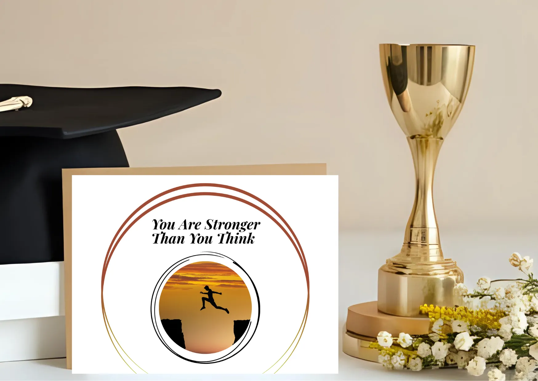 Send a powerful message of strength and resilience with our ‘You Are Stronger Than You Think’ greeting card. Perfect for encouragement, overcoming challenges, and inspiring a loved one to keep going. This motivational card features a striking image of a figure leaping a gap against a vibrant sunset. A heartfelt way to show support and remind them of their inner power.
