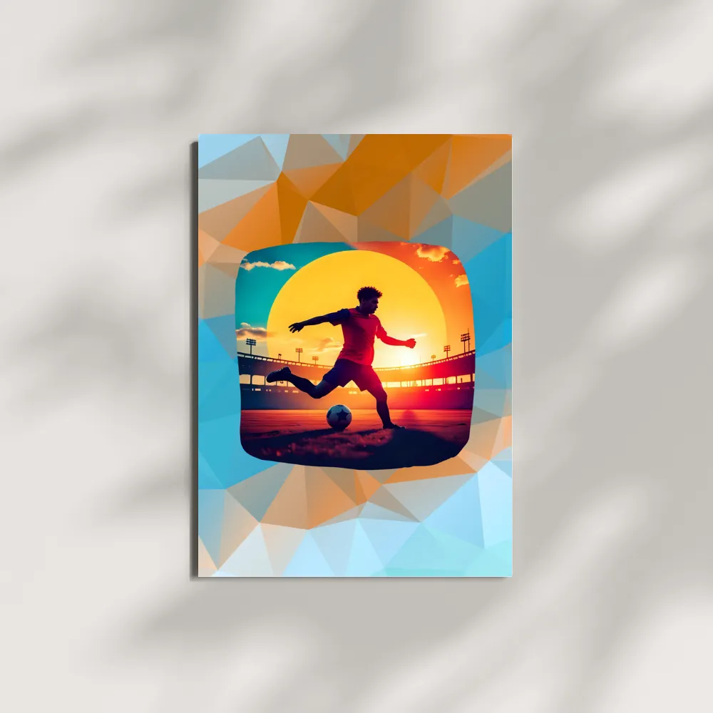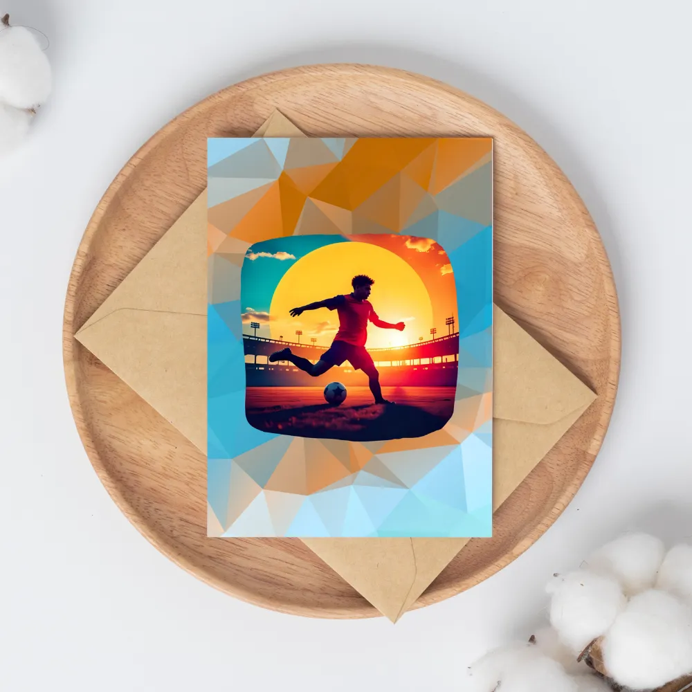 Our soccer greeting card features a high-energy, low-poly illustration of a striker at the moment of impact. Set against a blazing golden sun and a silhouetted stadium, the vibrant oranges and cool teals create a cinematic aesthetic that resonates with anyone who lives for the 90th minute. While most cards end up in a drawer, this piece is designed to be displayed. The bold, modern colors and sophisticated geometric lines make it a versatile decor piece. Whether you are celebrating a birthday, a big win, or a “good luck” for the upcoming season, this card serves as a permanent reminder of their dedication and love for soccer.